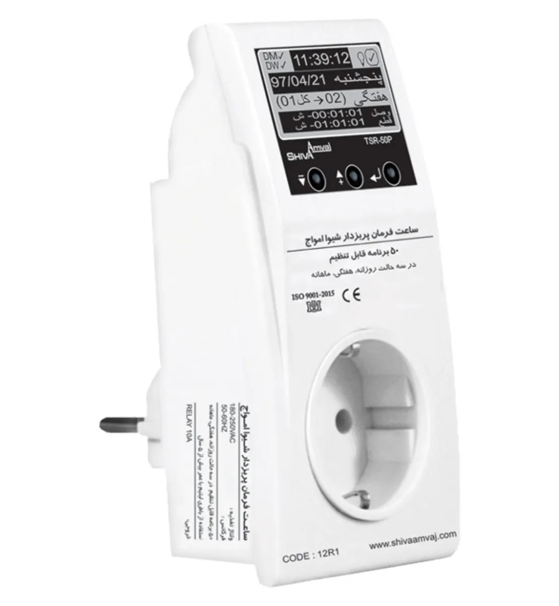 ساعت فرمان پریزدار شیواامواج ،دستگاهی مناسب برای روشن و خاموش کردن اتوماتیک وسایل برقی خانگی با 50 برنامه قابل تنظیم می باشد. هر برنامه،دارای یک زمان روشن و یک زمان خاموش است و در دوره های زمانی روزانه، هفتگی و ماهانه قابل تنظیم می باشد.