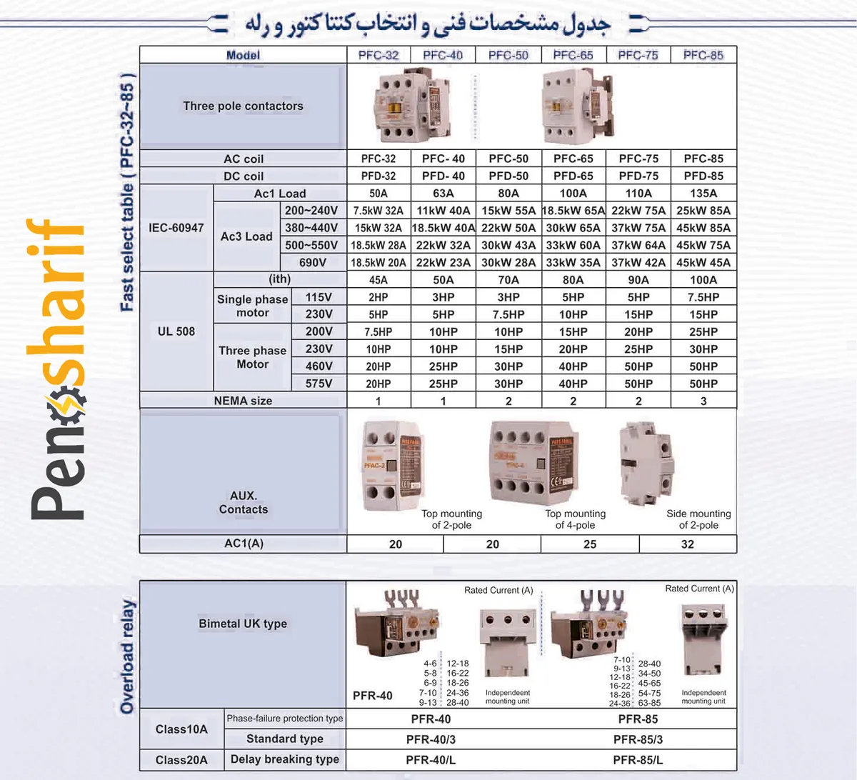 کنتاکتور پارس فانال، 40 آمپر، 18.5 کیلووات، بوبین 220 AC ، مدل PFC-40